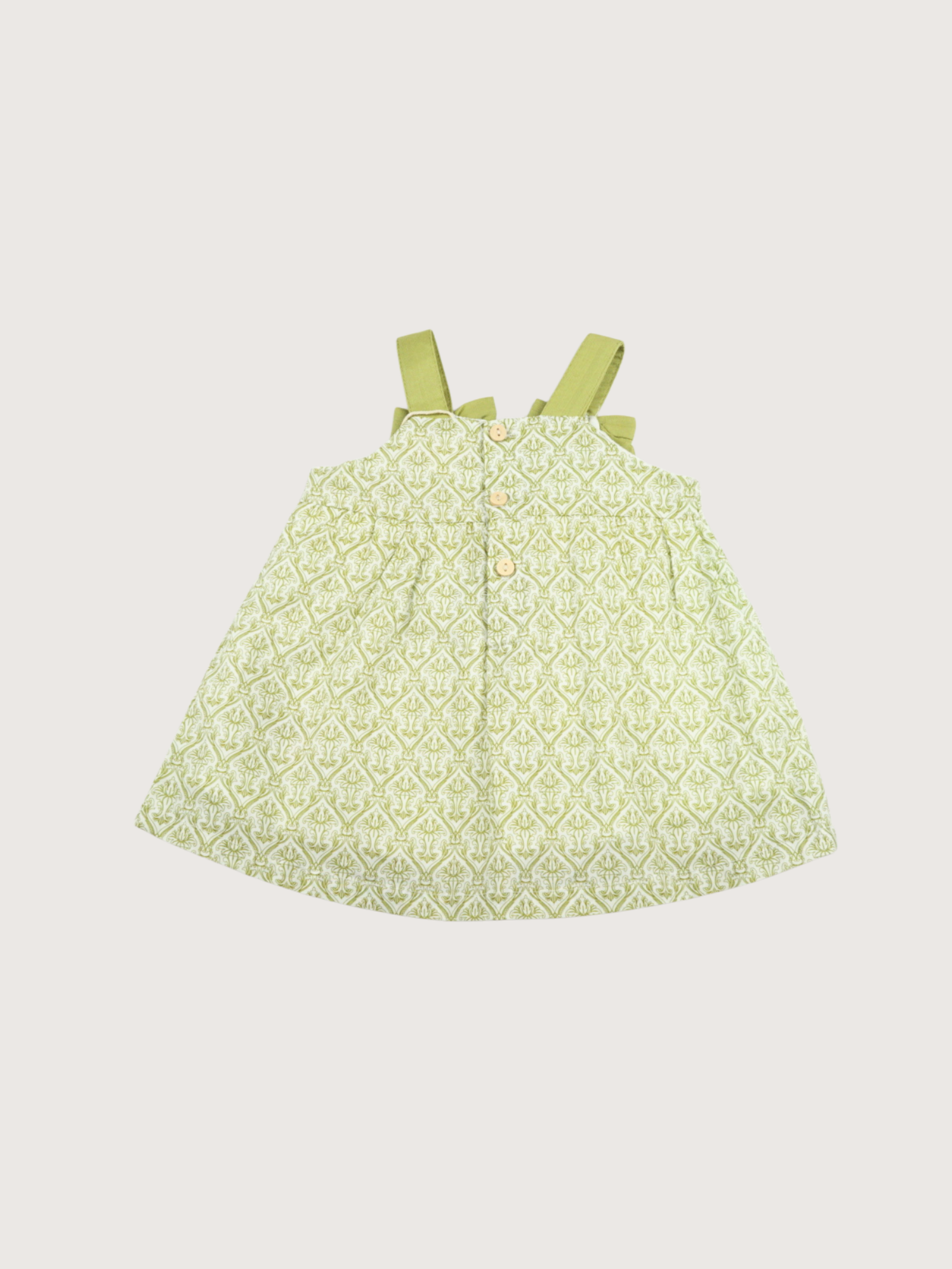 This airy dress with an elegant botanical print and striking green bow straps is a real eye-catcher. The built-in diaper pants ensure comfort, while the A-line model ensures a graceful and playful look. Perfect for parties, weddings or a summer day in style.