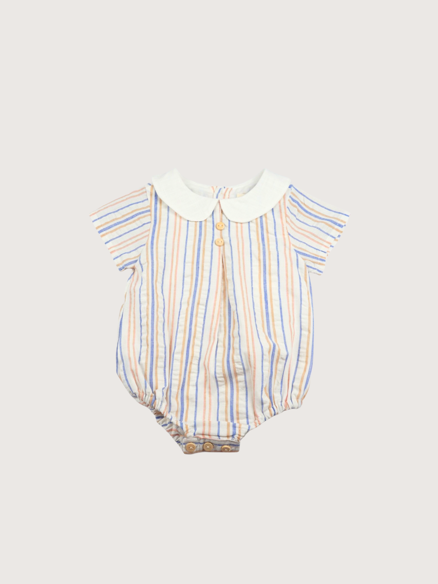 This linen romper with pastel stripes and a cute round collar is perfect for sunny days. The lightweight fabric ensures breathable comfort, while the wooden buttons and elastic legs finish it off perfectly. A timeless design for little trendsetters.