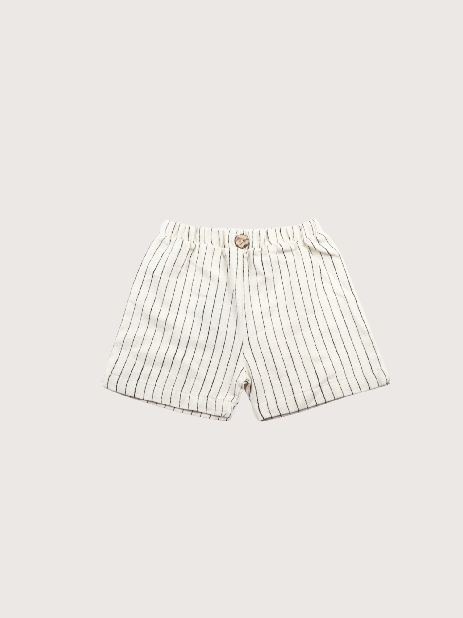 These beige shorts with fine vertical stripes are perfect for warm days. Made of a breathable, soft fabric with a comfortable elastic waistband and a decorative button for an extra stylish touch.