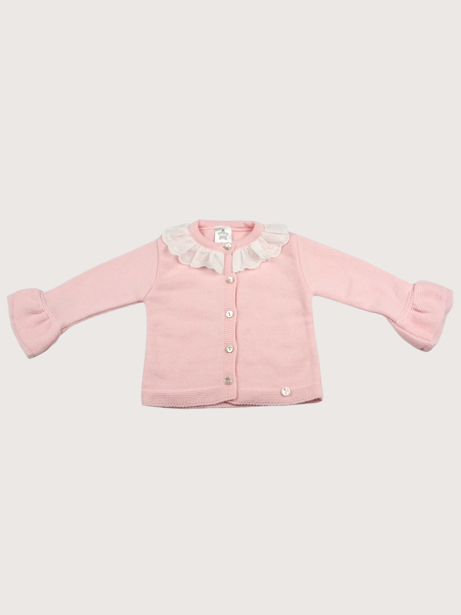 A romantic fine knitted jacket in soft pink with lovely ruffles on the collar and sleeves. The elegant buttons and subtle details make it a real eye-catcher for your little princess. Perfect for festive moments and cozy days at home.