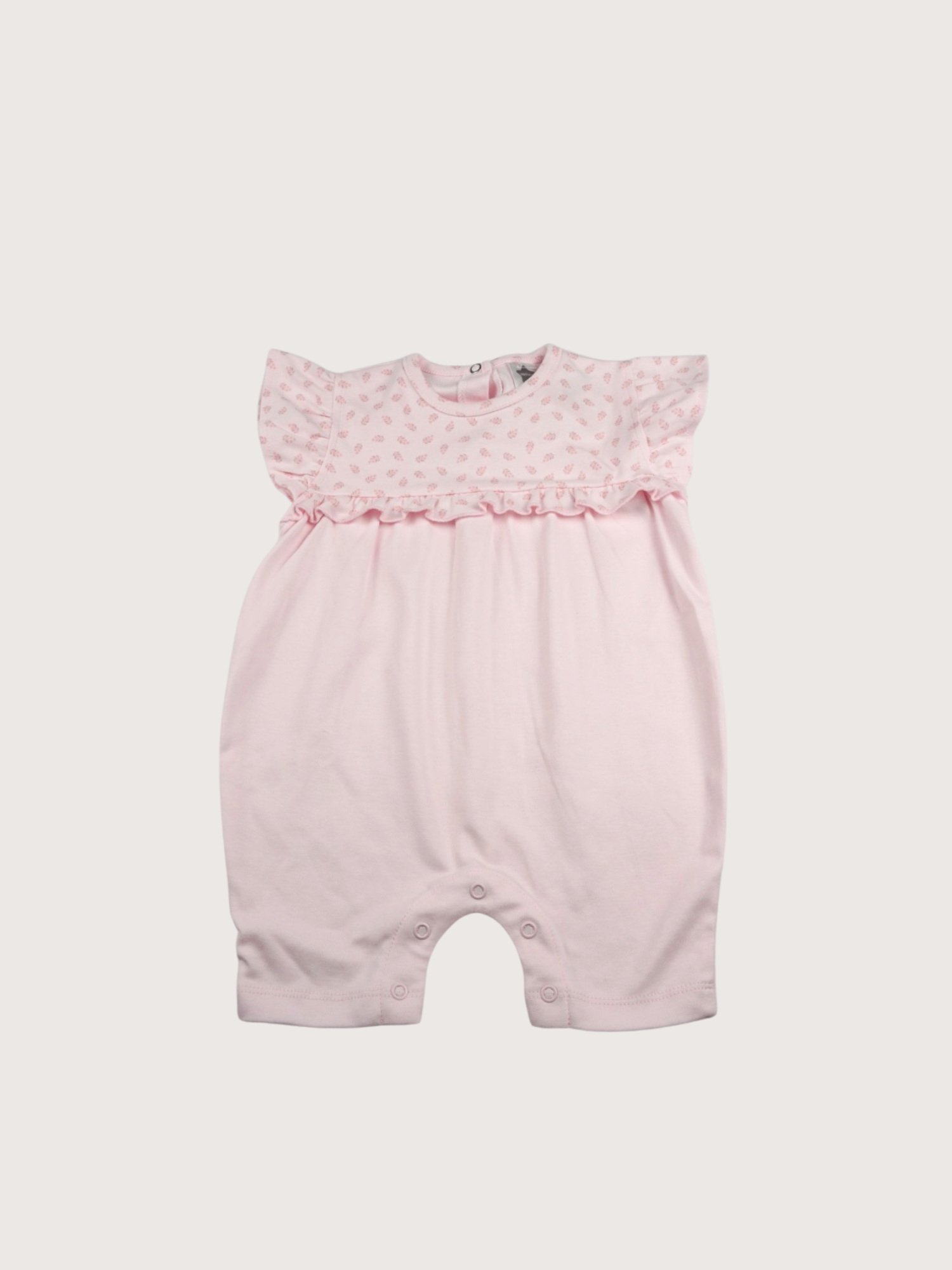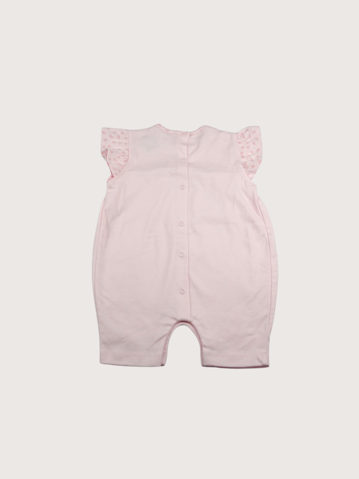 This cute romper in light pink is a nice mix of comfort and style. The ruffle at the bust line and the playful butterfly sleeves give the romper a sweet look. Thanks to the press studs at the bottom, changing is done in no time. A light and supple outfit for warm days.